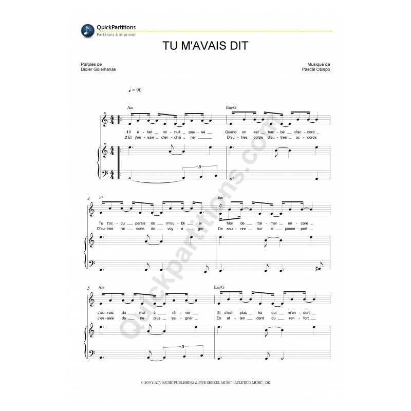 TU M'AVAIS DITPerformer : Pascal OBISPO Sheet music for piano vocal chords