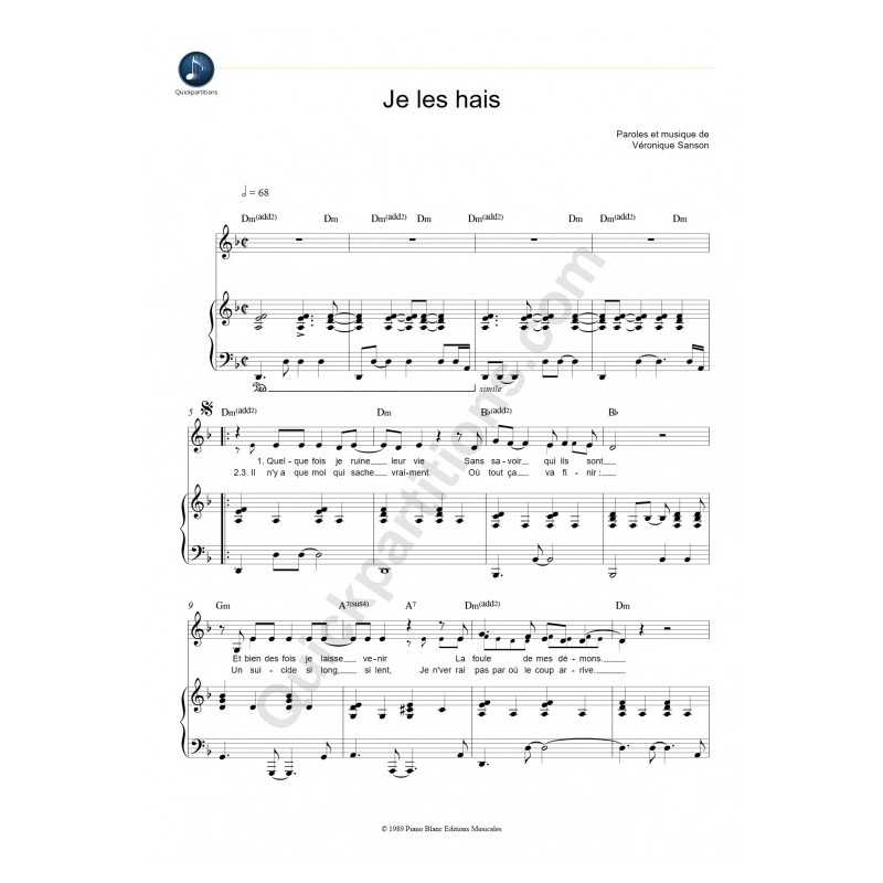 JE LES HAISPerformer : Véronique SANSON Sheet music for piano vocal chords