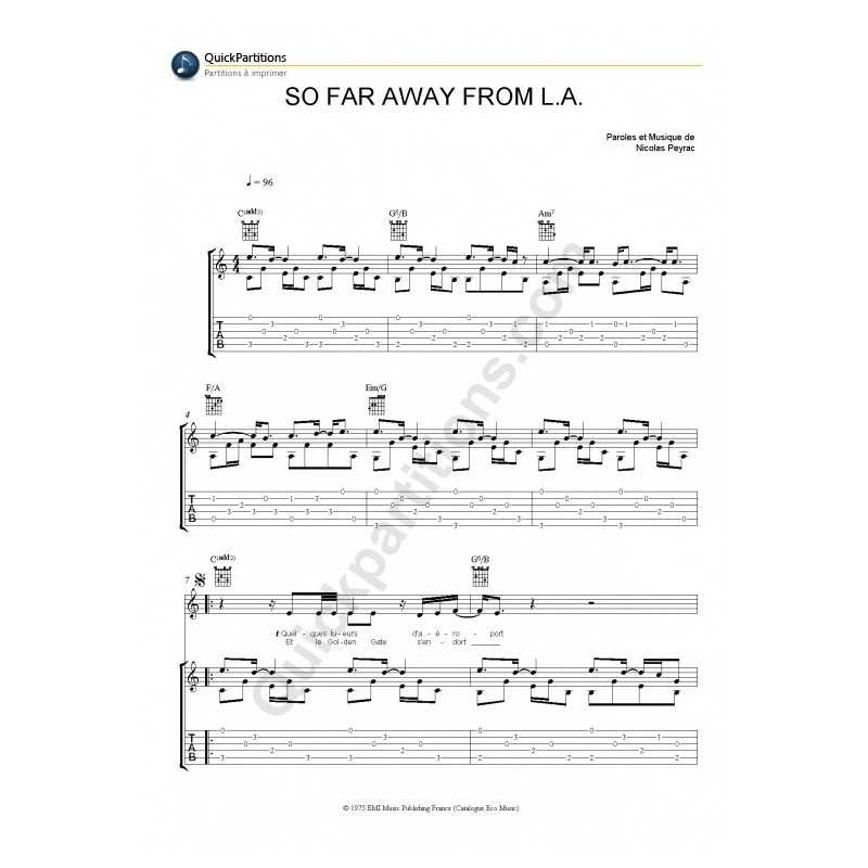 SO FAR AWAY FROM L.A.Interprète : Nicolas PEYRAC Partition Tablature GuitarePartition feuillet (reliure cahier 21x29,7cm).
