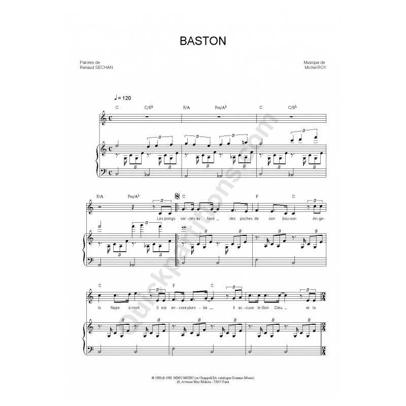 BASTONInterprète : RENAUD Partition Piano/Chant/AccordsPartition feuillet (reliure cahier 21x29,7cm).