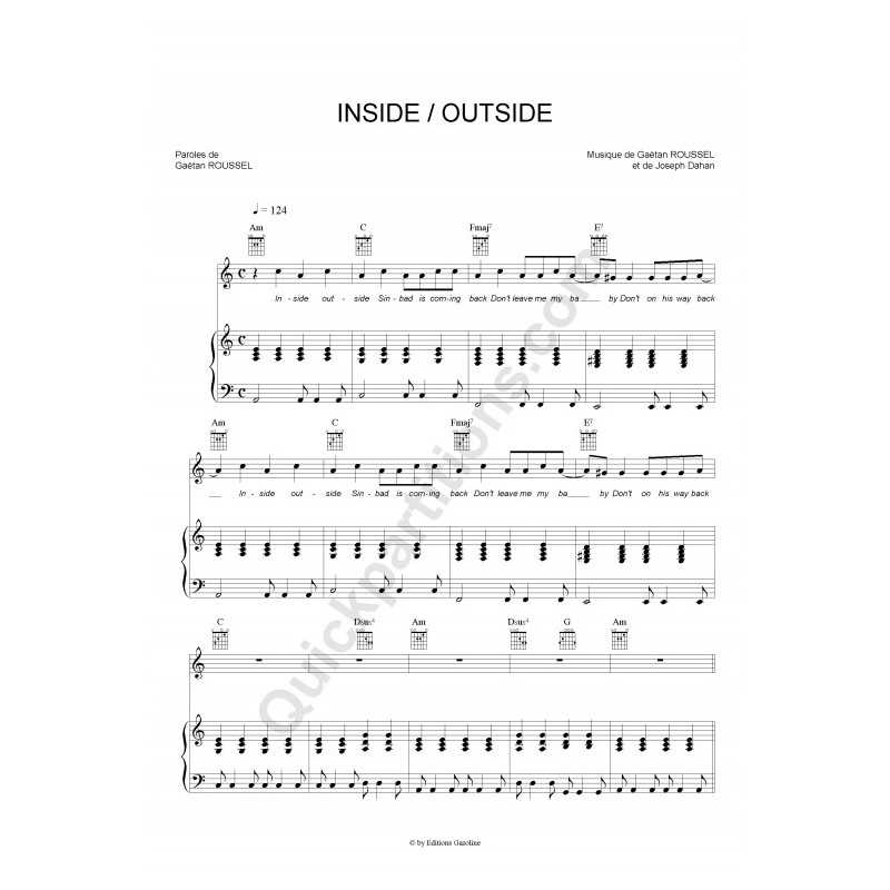 INSIDE / OUTSIDEInterprète : Gaëtan ROUSSEL Partition Piano/Chant/GuitarePartition feuillet (reliure cahier 21x29,7cm).