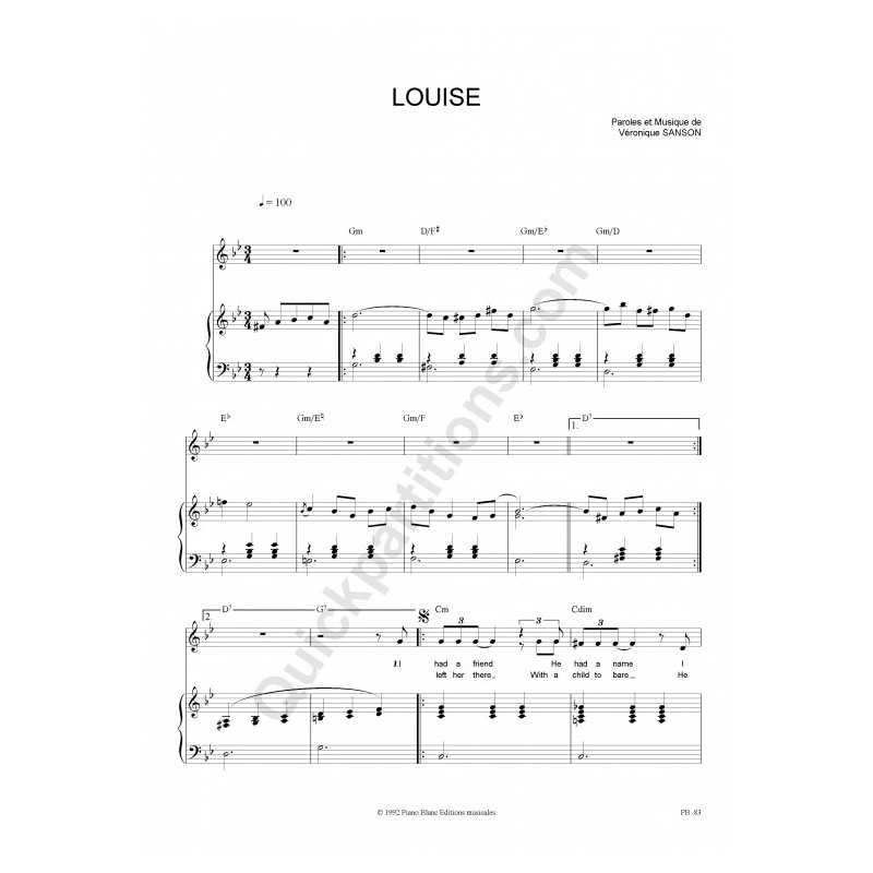 LOUISEInterprète : Véronique SANSON Partition Piano/Chant/AccordsPartition feuillet (reliure cahier 21x29,7cm).