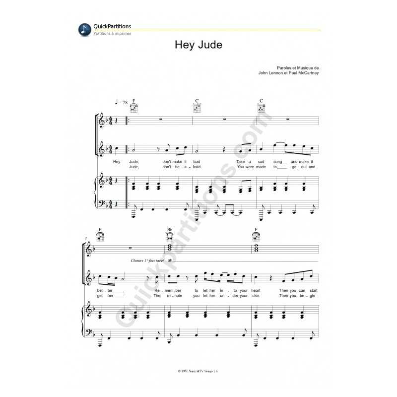 HEY JUDEInterprète : THE BEATLES Partition Piano/Chant/GuitarePartition feuillet (reliure cahier 21x29,7cm).